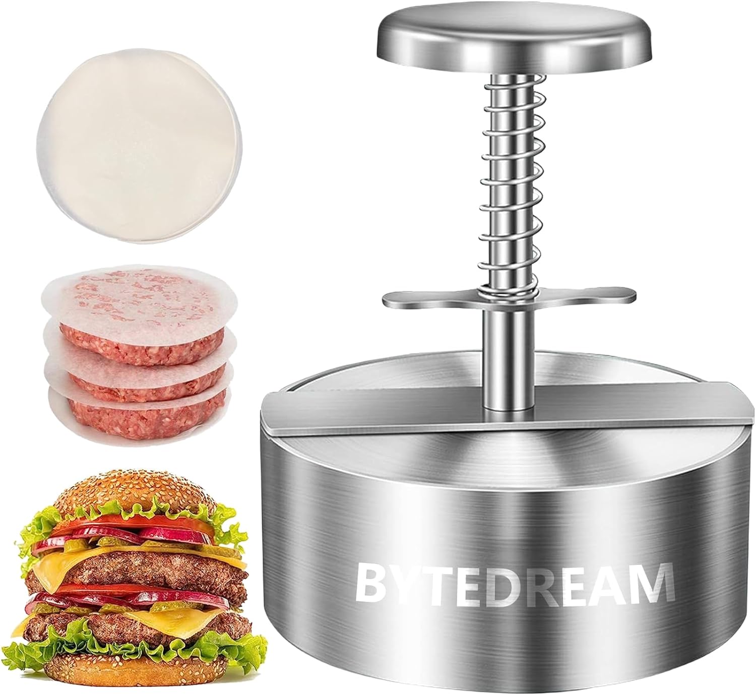 Elevate your burger game with the BYTEDREAM Burger Press. Made of durable stainless steel, it’s rust-proof and dishwasher safe. Comes with 100 free hamburger patty papers. Pressing made easy with the spring-loaded plunger button. German designed for quality. Get yours now!