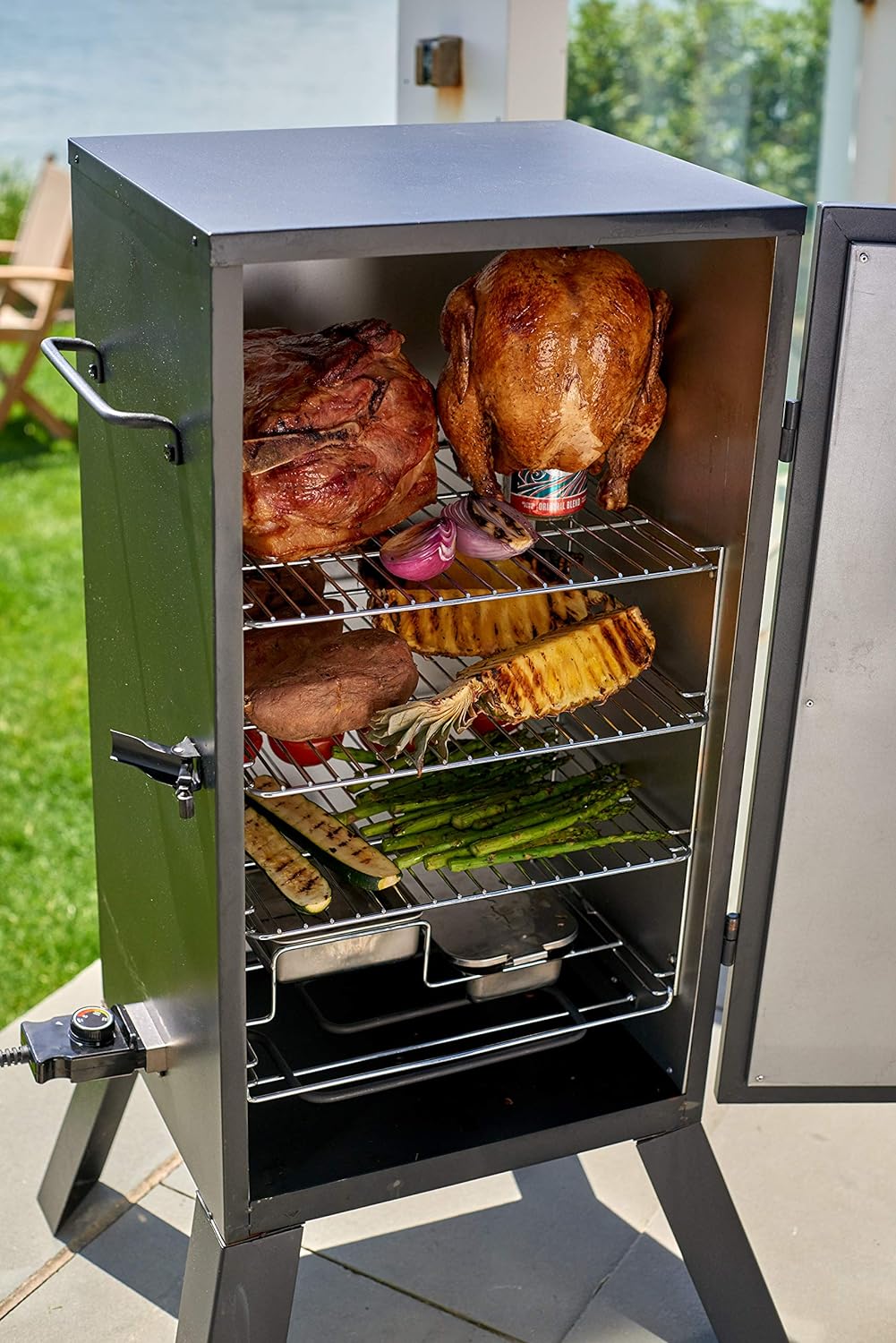 But what sets this electric smoker apart is its built-in thermometer. With an easy-to-read display on the front door, you can monitor the internal temperature of your food without opening the smoker and losing heat. This ensures perfectly cooked meats and vegetables every time.