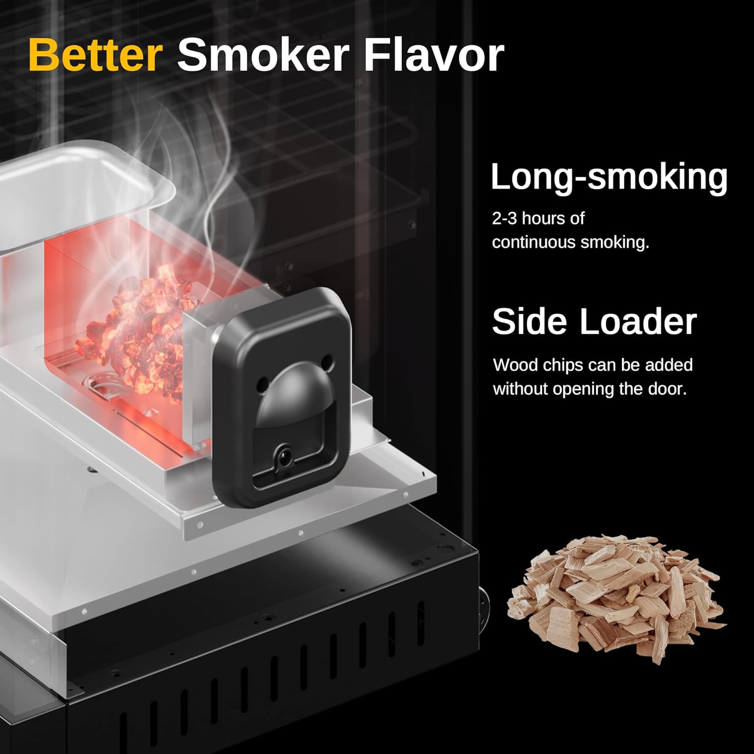 A: The side wood chip loader allows for continuous smoking for 2-3 hours without the need to open the door and add chips.